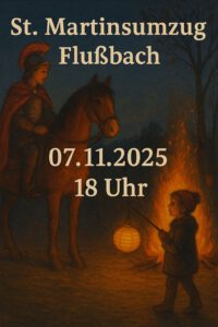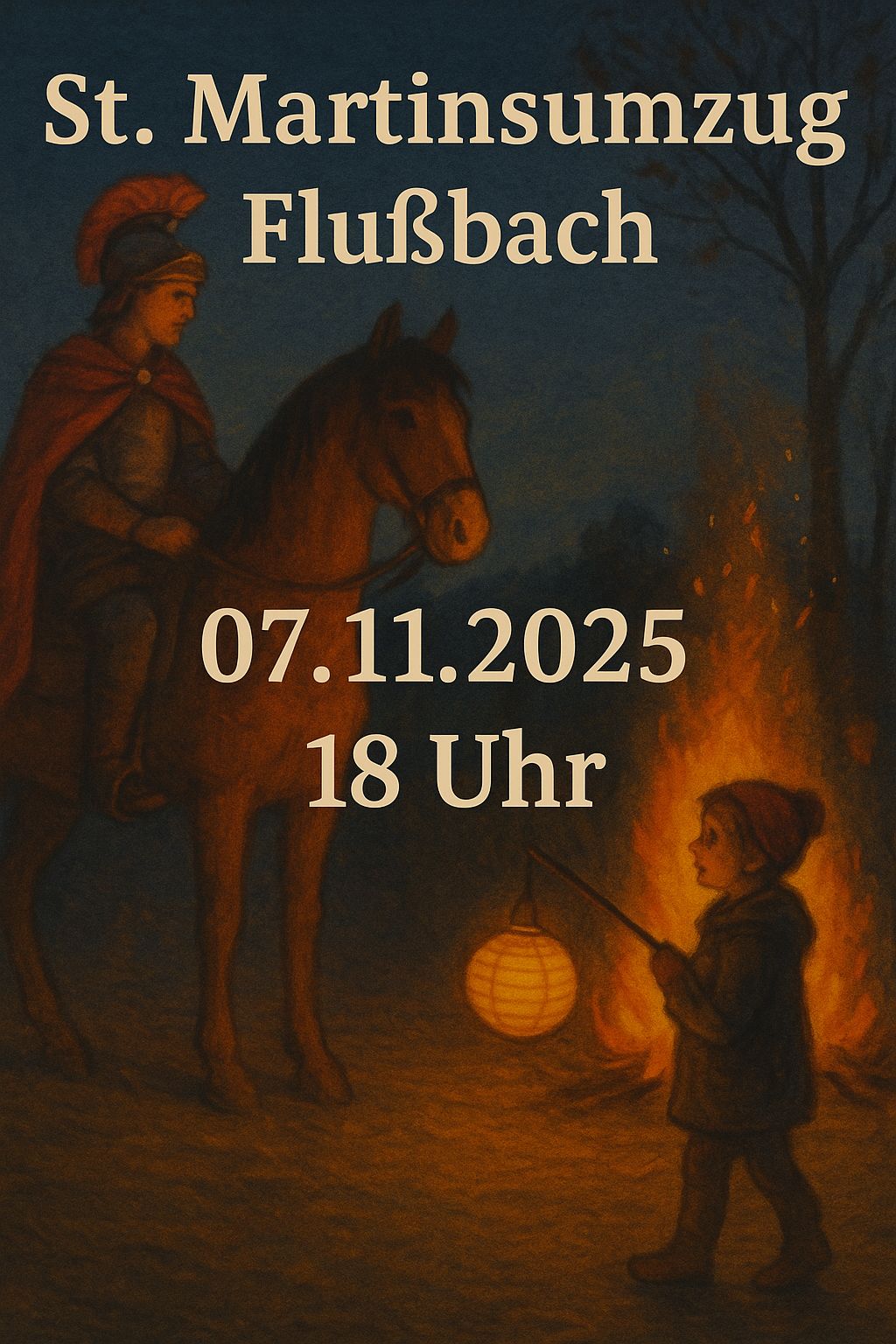Am Freitag, den 7. November 2025, findet der diesjährige St. Martinsumzug in Flußbach statt. Beginn ist um 18:00 Uhr am Bushäuschen. Von dort zieht der Martinszug, angeführt von St. Martin auf dem Pferd und begleitet vom Musikverein Lüxem, durch die Straßen des Ortes bis zur Feuerstelle.